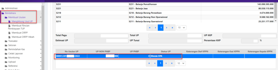 • Usulan UP yang ditolak oleh KPA akan kembali ke operator modul bendahara dengan status