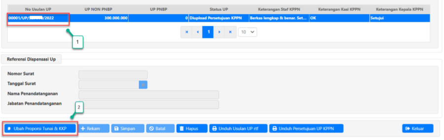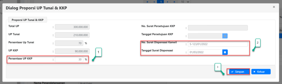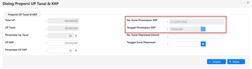 proporsi persentase UP KKP, kolom UP Tunai dan UP KKP akan menampilkan besaran