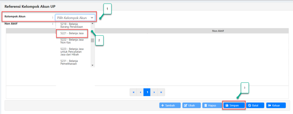 2. Akan muncul daftar kelompok akun, pilih salah satu (contoh: 5221 – Belanja Jasa)