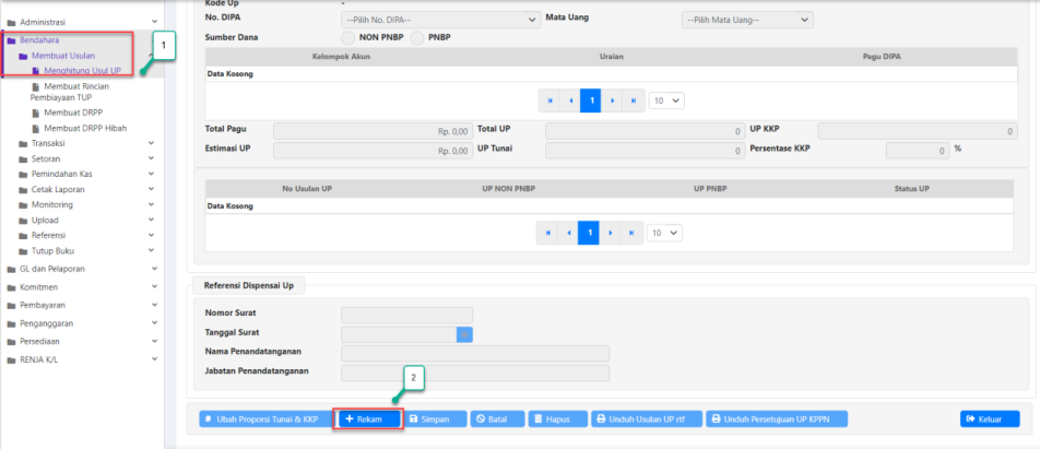 2. Merekam Usulan UP. Besaran total UP yang diisikan mengacu pada UU APBN, kemudian