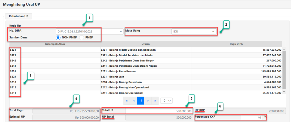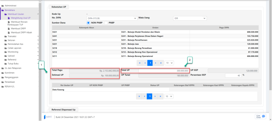 Aplikasi akan secara otomatis menghitung total pagu dan estimasi UP. Pada contoh gambar